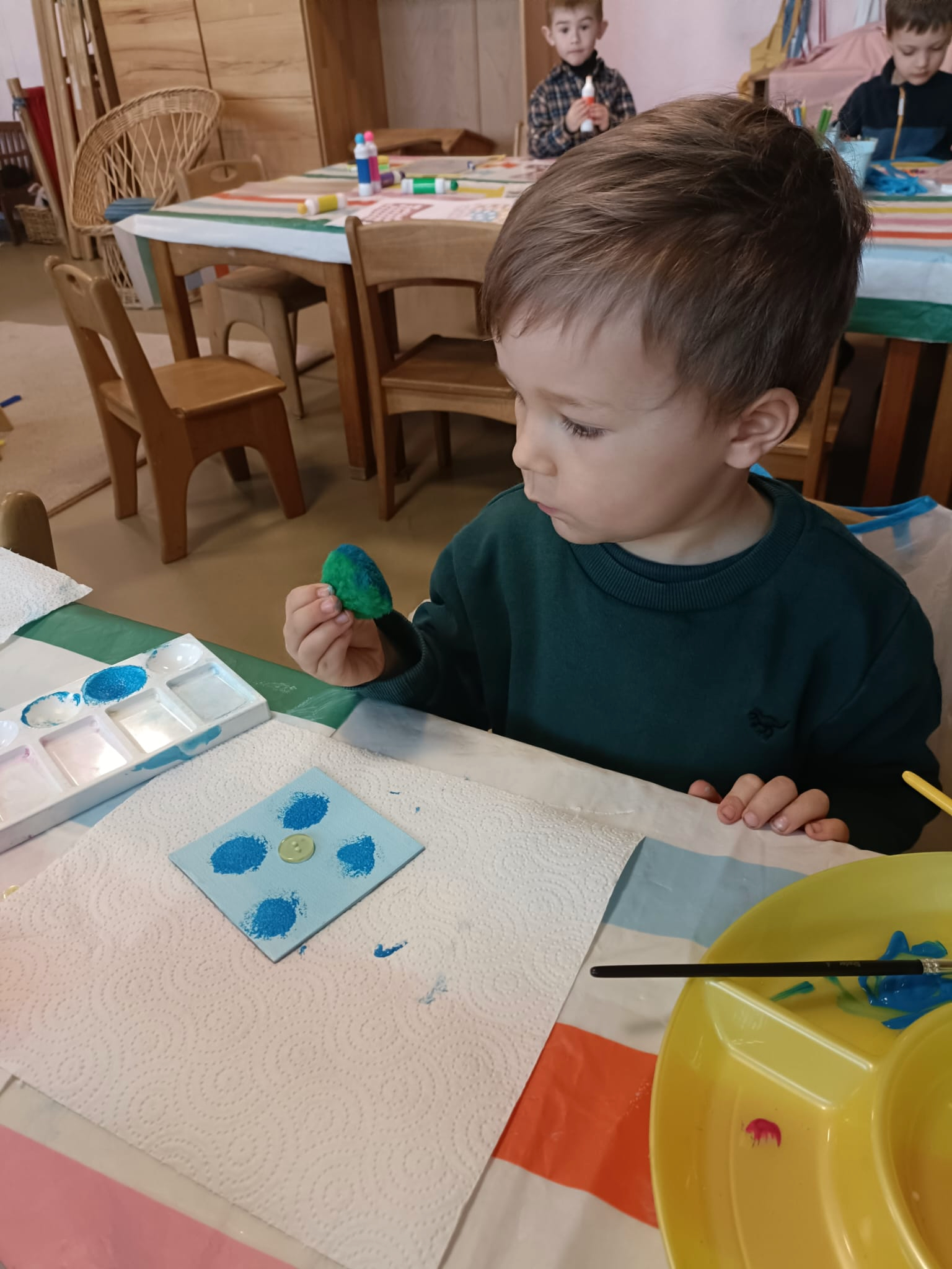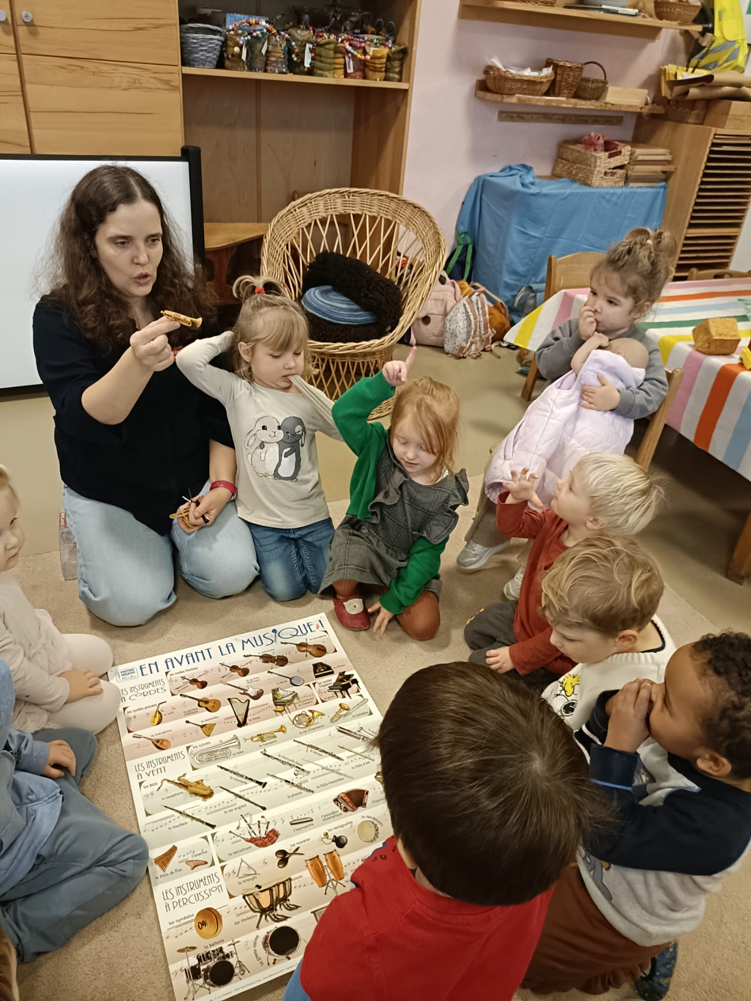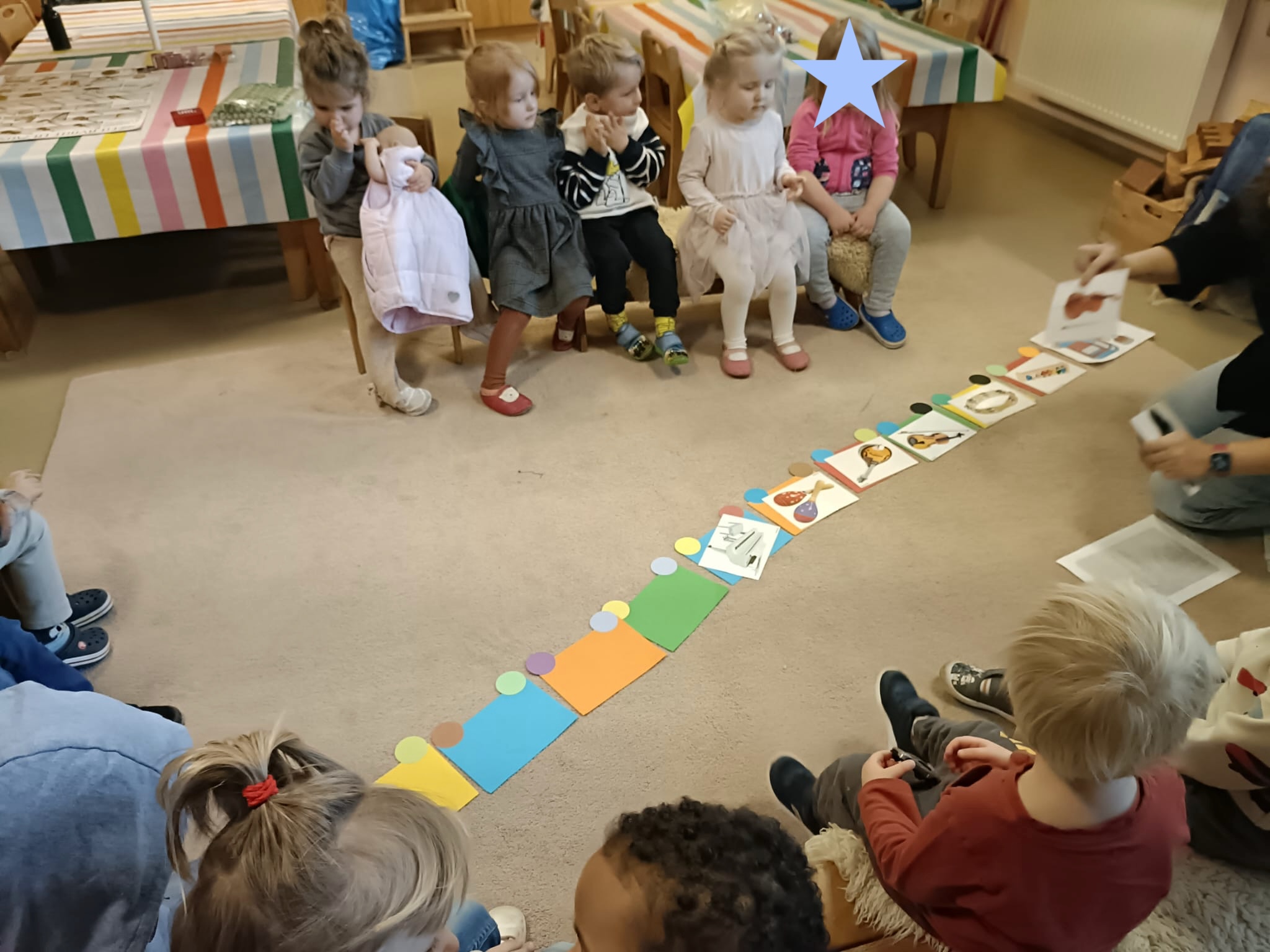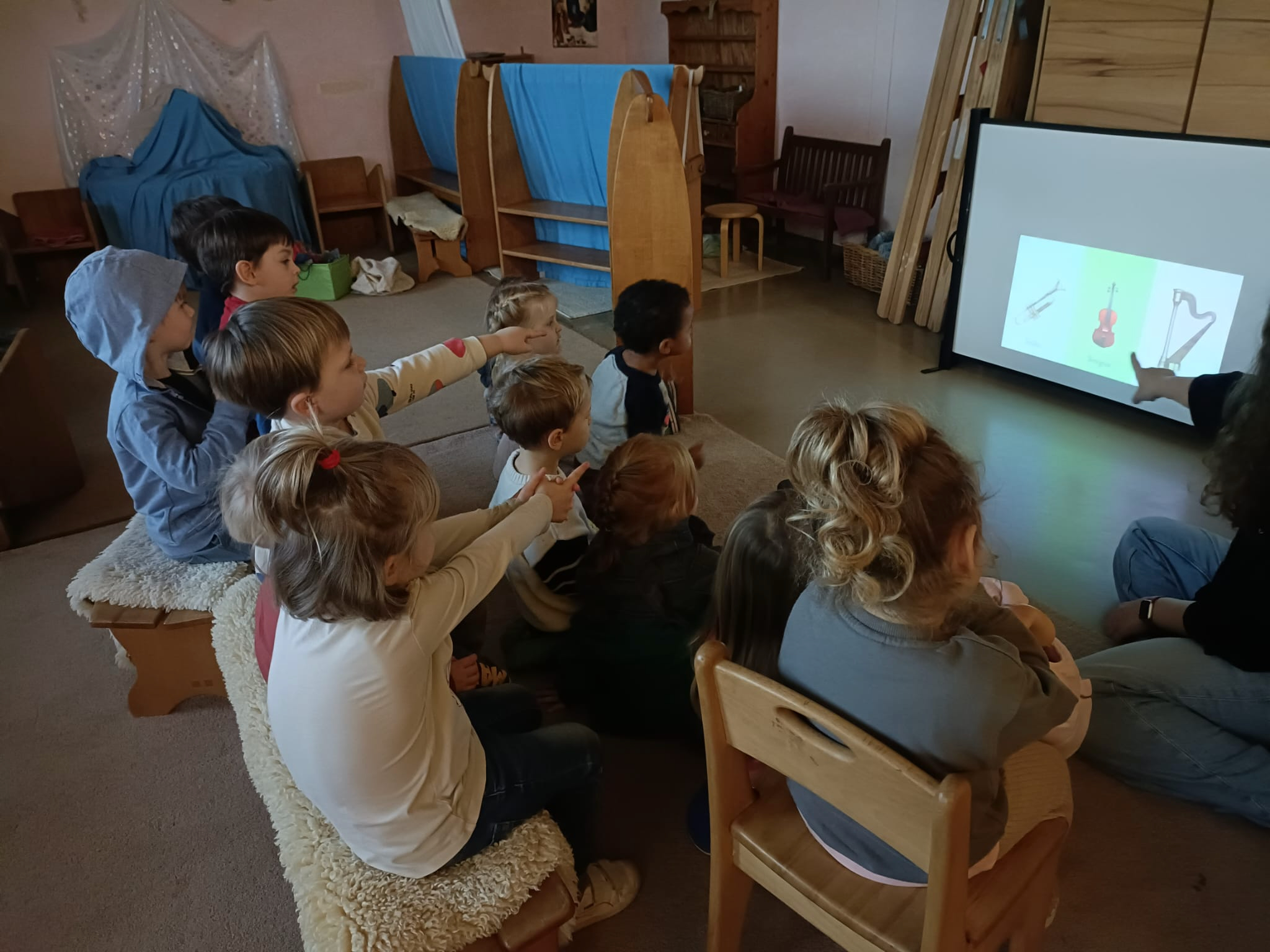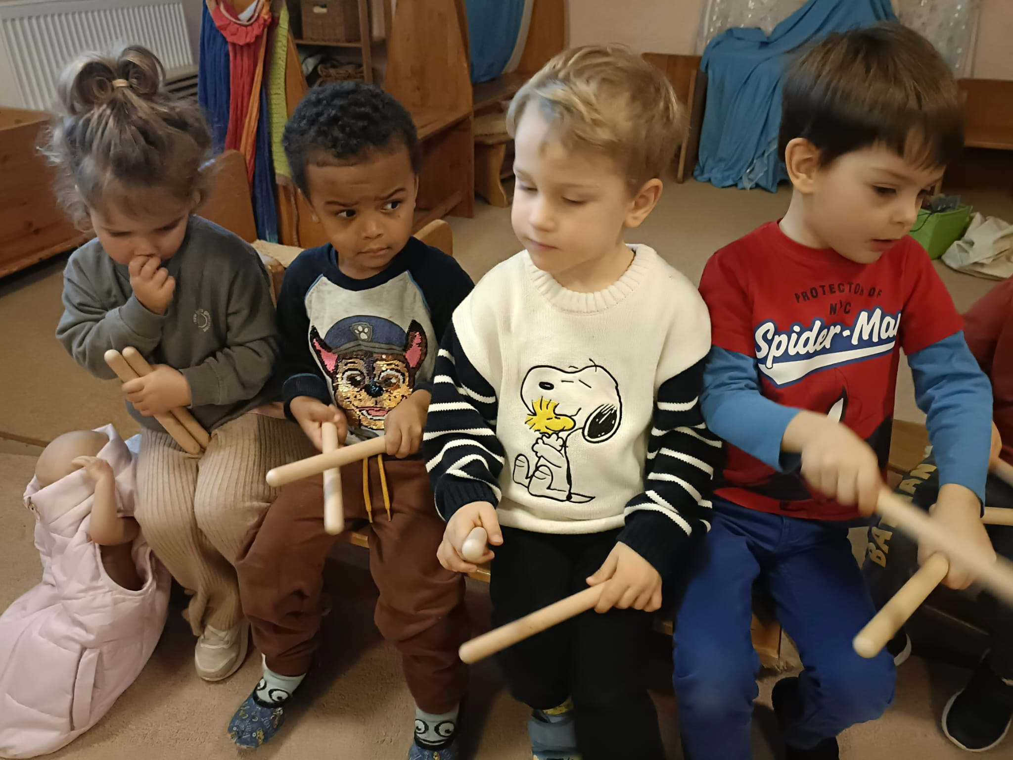 Na zajęciach o muzyce graliśmy na instrumentach, słuchaliśmy muzyki i muzycznych zagadek, poznawaliśmy nazwy instrumentów oraz tworzyliśmy obrazki inspirowane pracami malarza, który widział muzykę (Wassily Kandinsky).