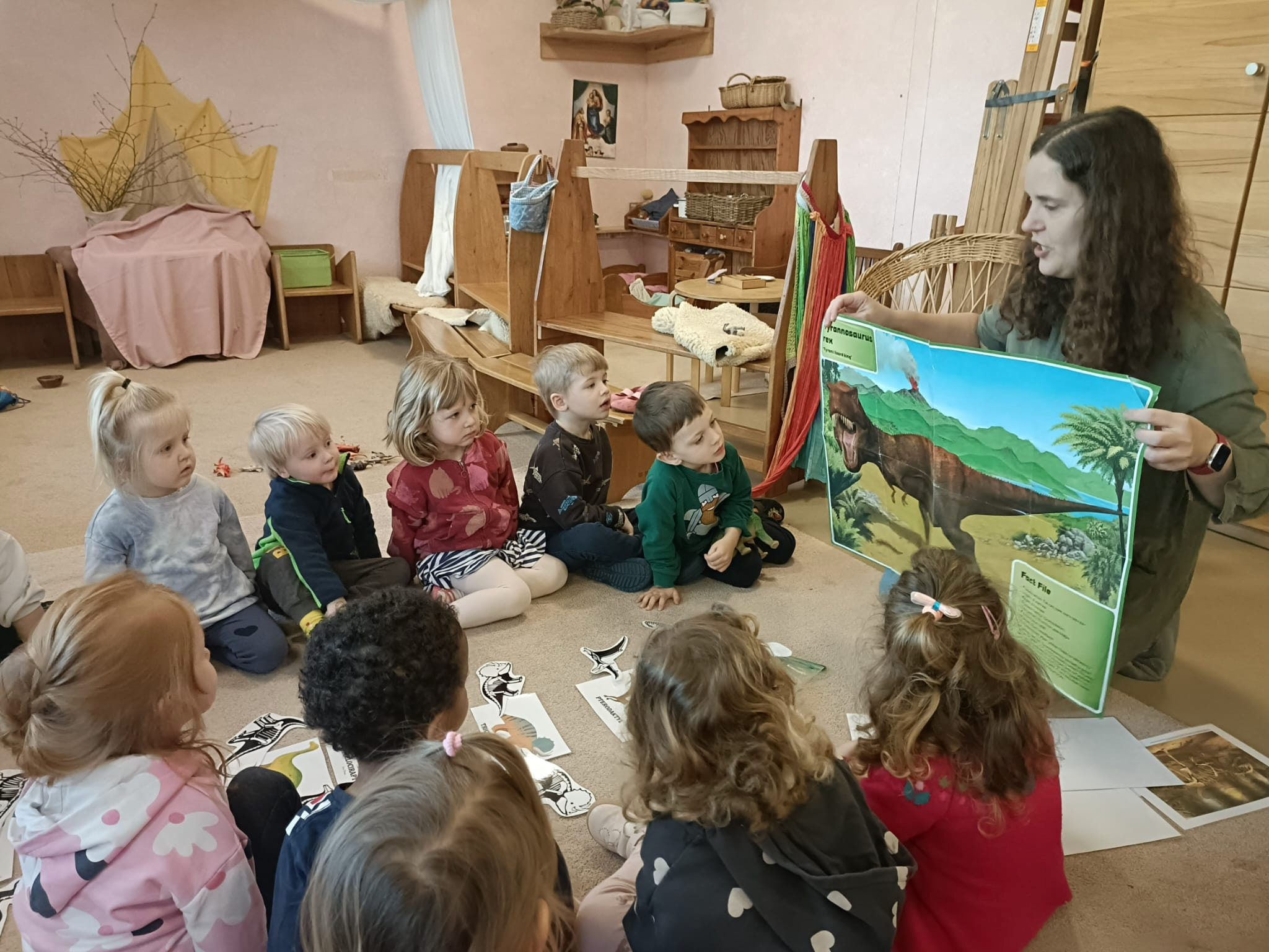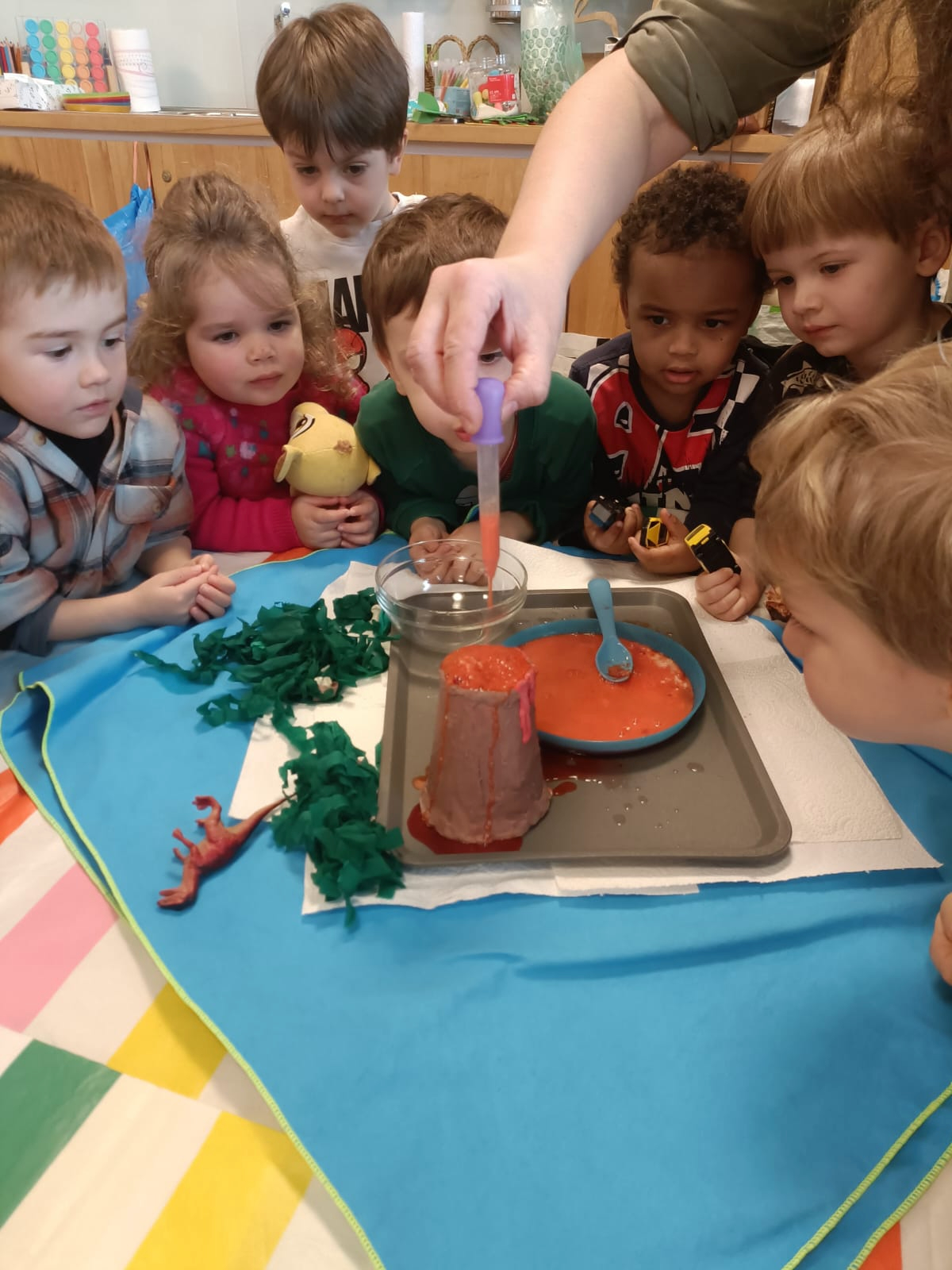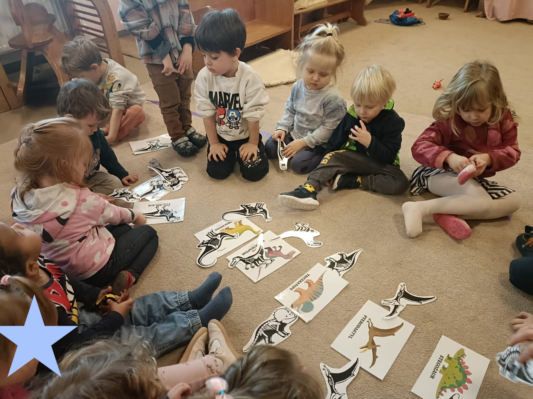 Na kolejnych zajęciach przenieśliśmy się w czasie, by poznać dinozaury. Bawiliśmy się w paleontologów, rozpoznawaliśmy kształty i nazywaliśmy dinozaury, dzieliliśmy je na mięso- i roślinożerne. Spore wrażenie zrobiły wybuchy wulkanu.