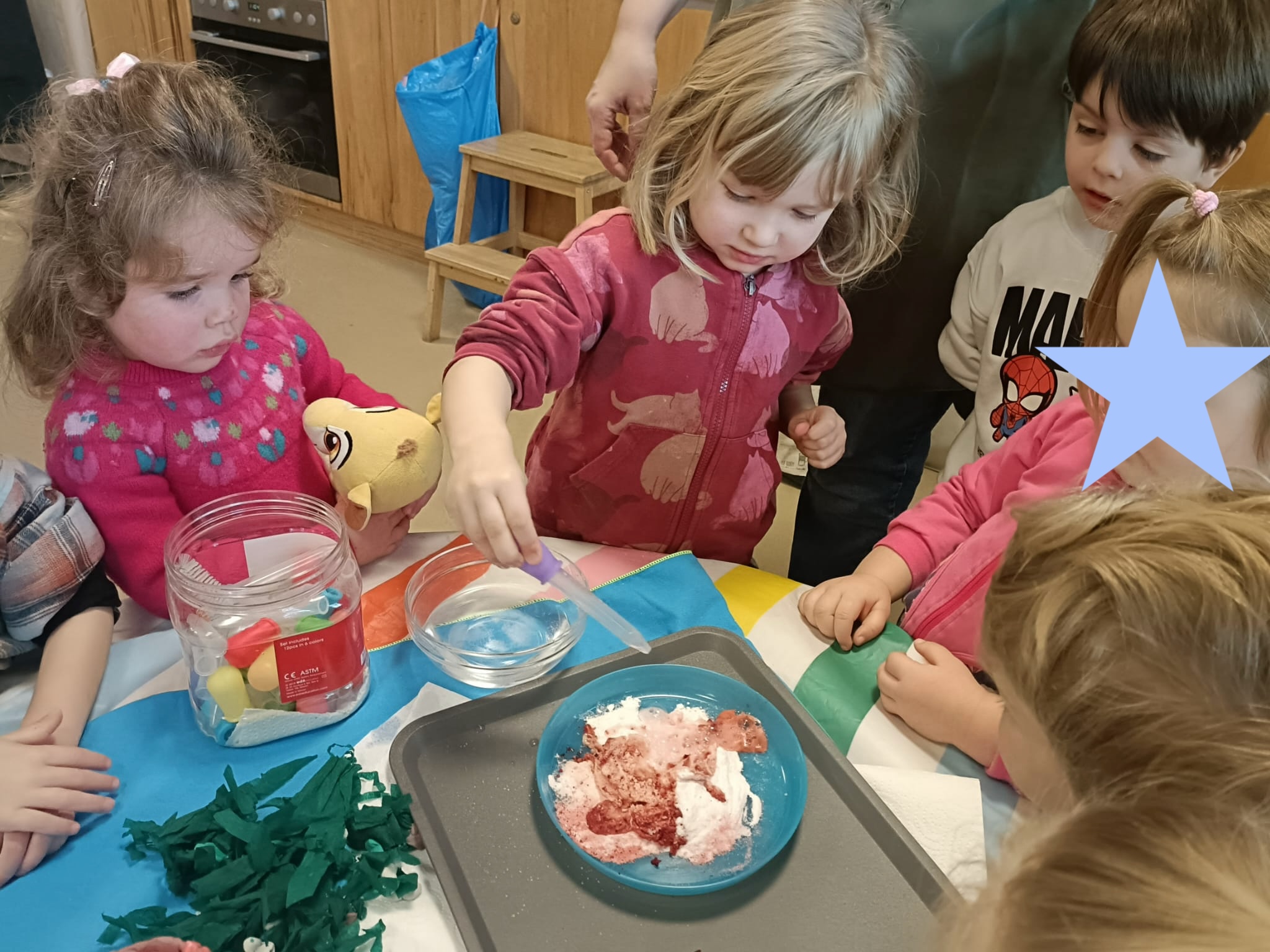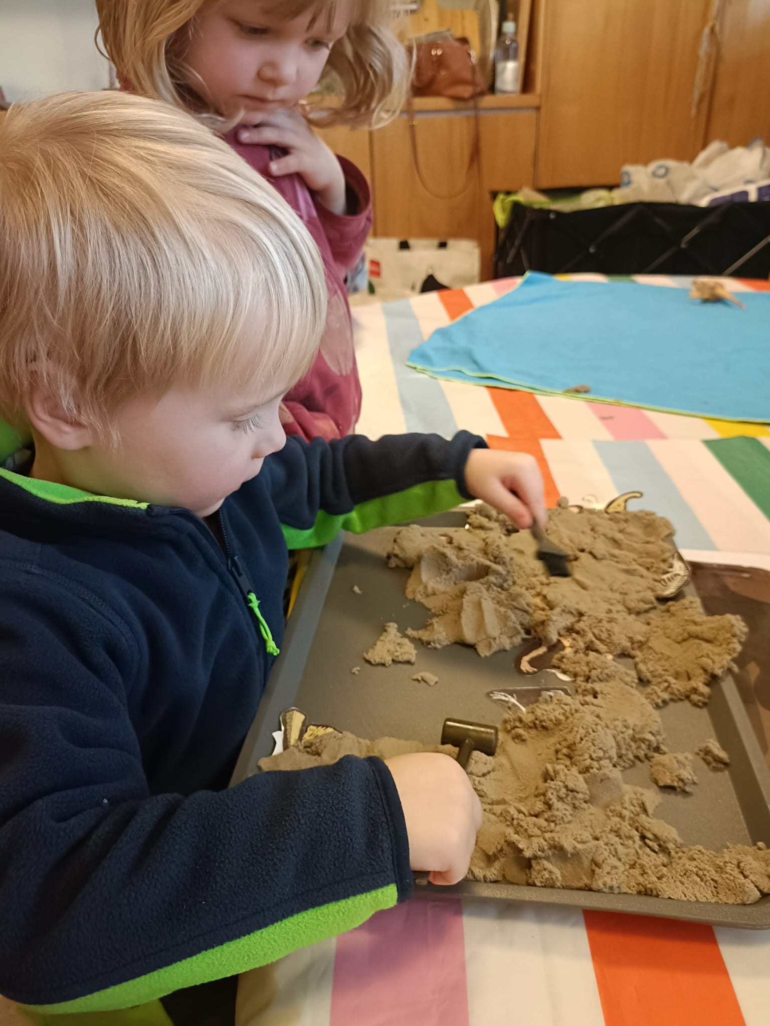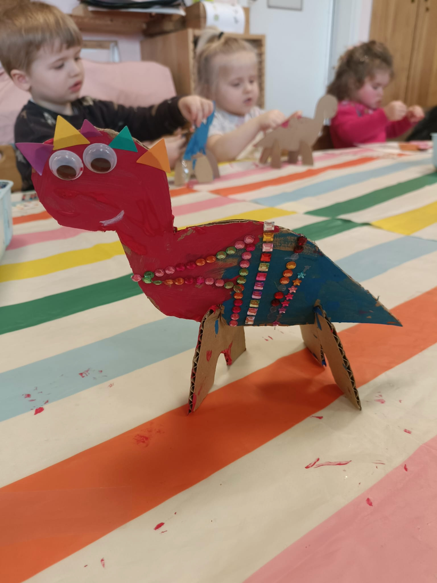 Na kolejnych zajęciach przenieśliśmy się w czasie, by poznać dinozaury. Bawiliśmy się w paleontologów, rozpoznawaliśmy kształty i nazywaliśmy dinozaury, dzieliliśmy je na mięso- i roślinożerne. Spore wrażenie zrobiły wybuchy wulkanu.